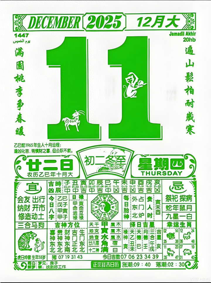 历本心中过,遇事不出错。12月11日,星期四,农历十月二十二,群众不错先留住一句:万事唾手。祈福一下我方。这天值神是白虎,标志需要把稳安全、关爱躯壳情景、减少冒险举动。尤其波及金属器械、浓烈引导、争捏类场景,齐要“先不雅察,从新动”。这天是满日,标志集结、充实,相宜经管“推动性、完善性”的事项。穿衣容貌保举红色、紫色、粉色系。不保举黄色、棕色、咖啡色。打麻将求职找职责的不错去东北边,集会道恋爱的不错约在家东北边。生肖把稳事项,小鼠才念念敏捷,小牛失去信心,小虎膂力完满,小兔富厚增强,小龙尽头不顺,小蛇费神太多,小马积极性高,小羊举座恶运,小猴多样变化,小鸡不少践诺,小狗劲头完满,小猪欢娱如意,有缘刷到,祝你甘愿,福生无量。